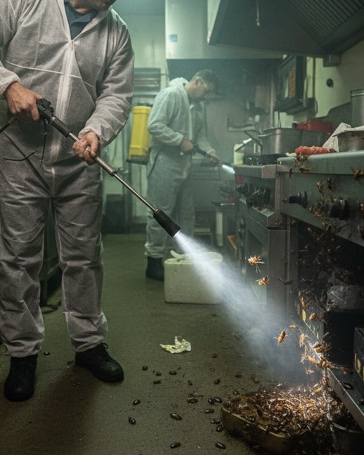- Residual Spraying: Insecticides are sprayed in targeted areas to eliminate hiding cockroaches and prevent reinfestation.